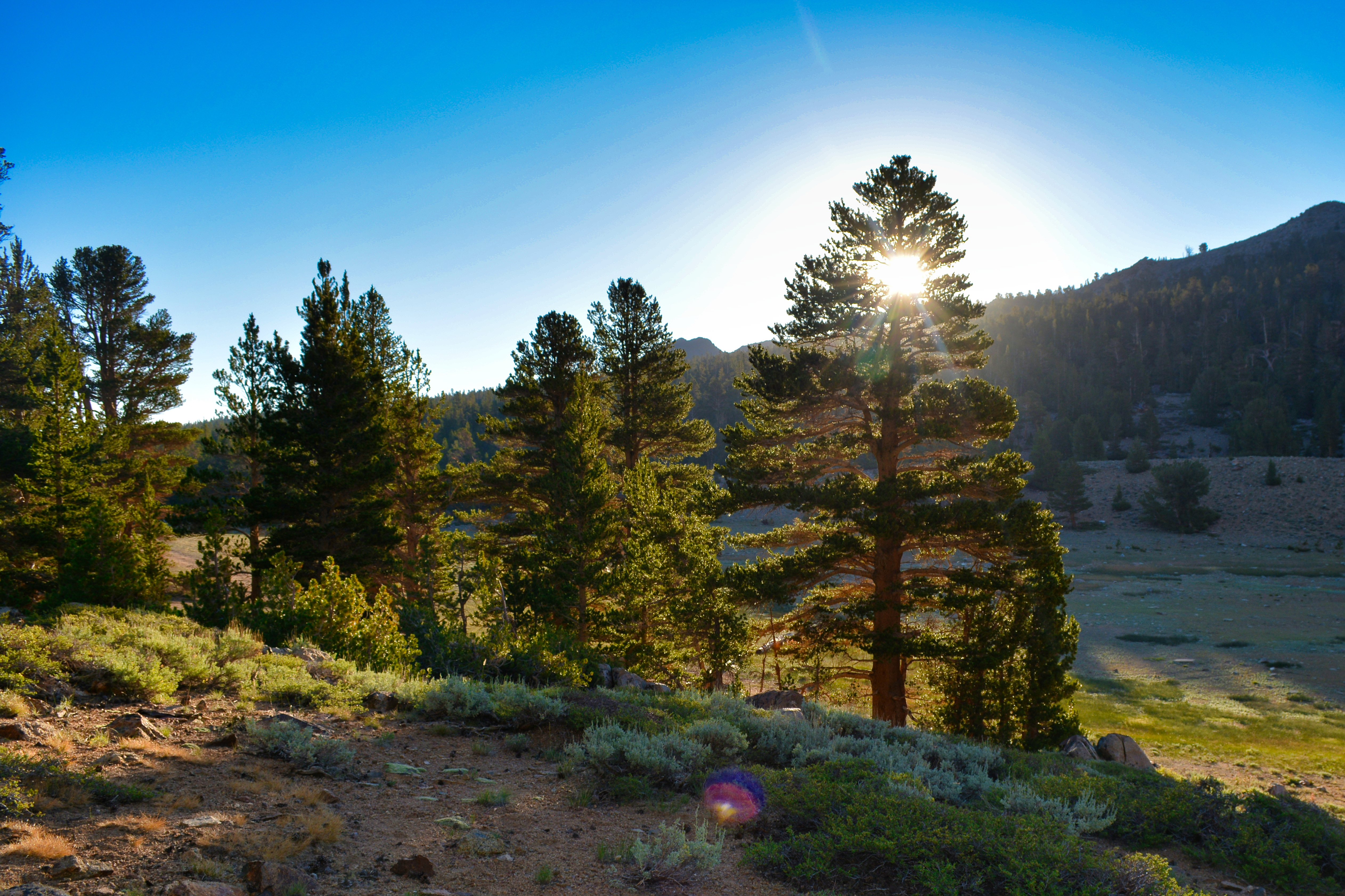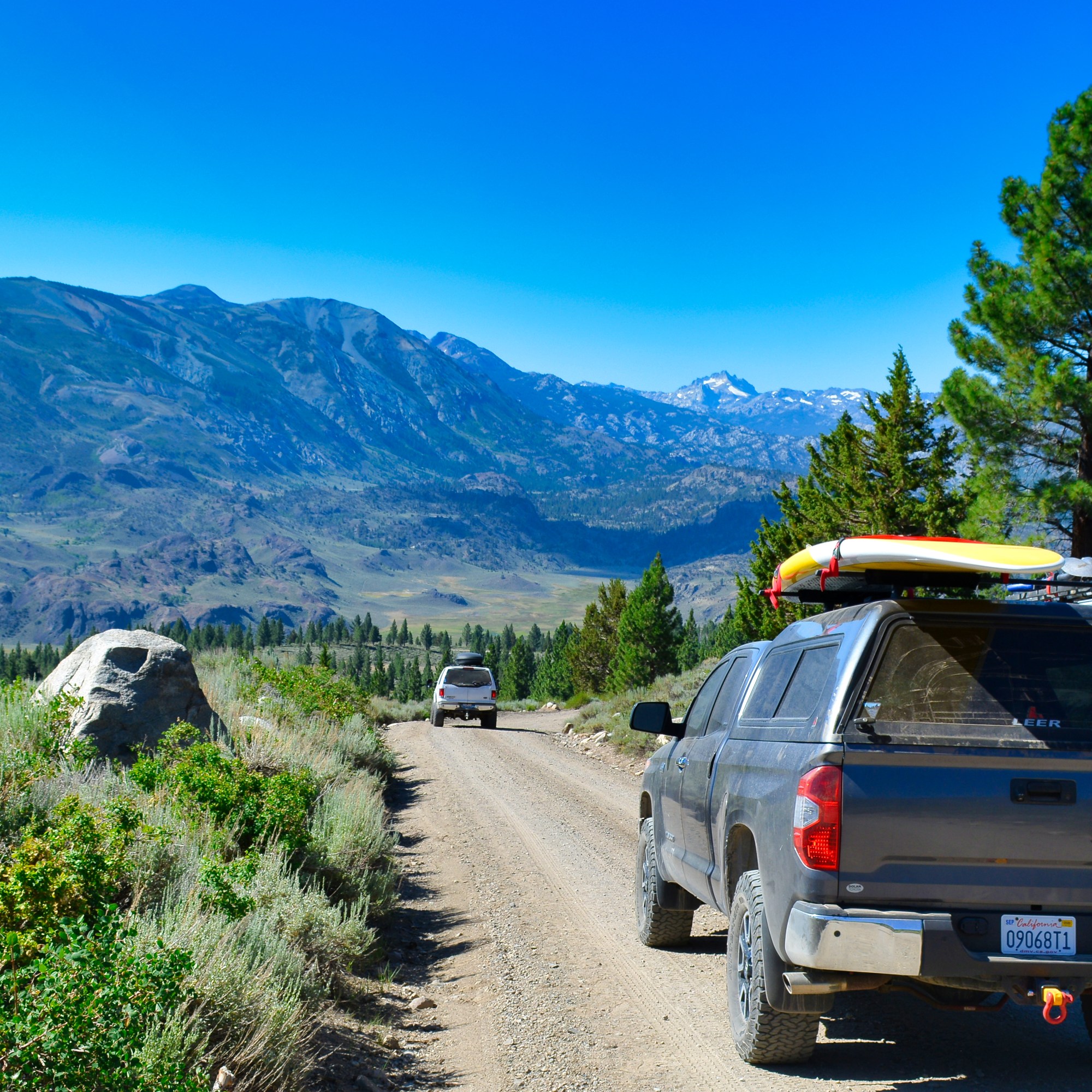 West of town, our climb up towards coyote flat was dusty, steep, and technical. Difficult, yet easily achievable by any four-wheel drive with off-road tires. The stresses of the valley shed away as we passed 10,000 ft and set course for a small alpine lake at the western fringe of the flat. Danny was in the lead and spotted a good camp in a grove of pinions. We prepared dinner, then watched quietly as the sun passed behind us, and started a small, contained fire to keep out the evening chill.